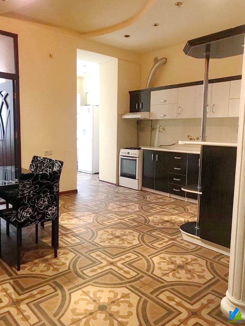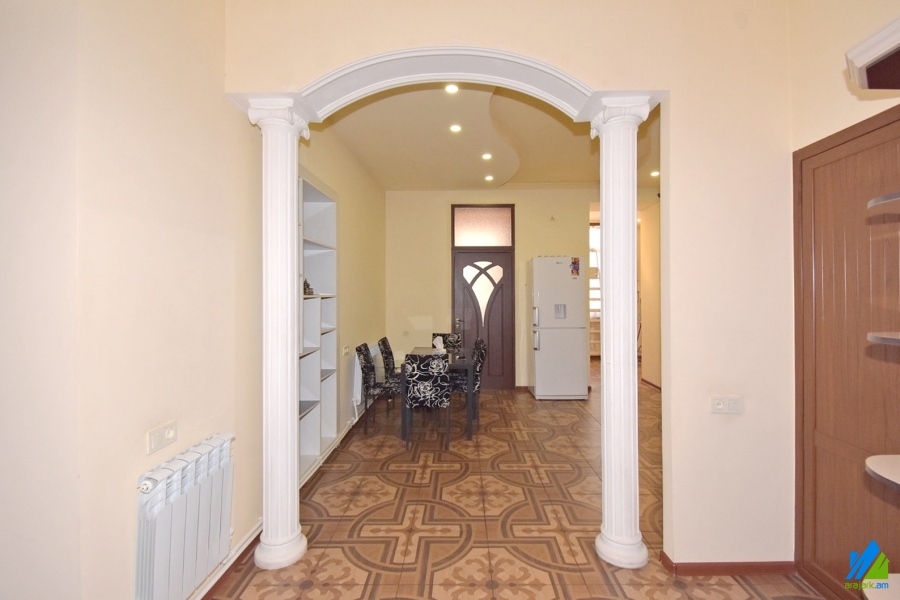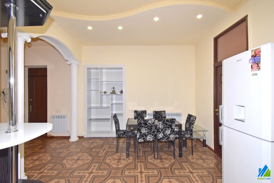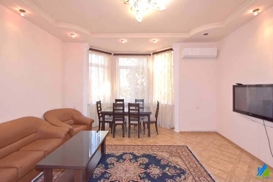 An apartment for rent in Tigran Mets Avenue (near the Yerevan Cinema). The rooms' quantity is 3 (1 hall and 2 bedrooms). The apartment is newly renovated and is located on the 4th floor of the 5-storey stone building, that is stationed on the first line. The entrance door is iron-made, the windows are euro-based, the floor is covered by laminate. The bathroom is combined, tiled, the electric wires and pipes are newly changed. The apartment has an air-conditioner, individual heating system and is supplied with constant water and gas. The entrance is from the street. The view is towards the yard and T. Mets Avenue.