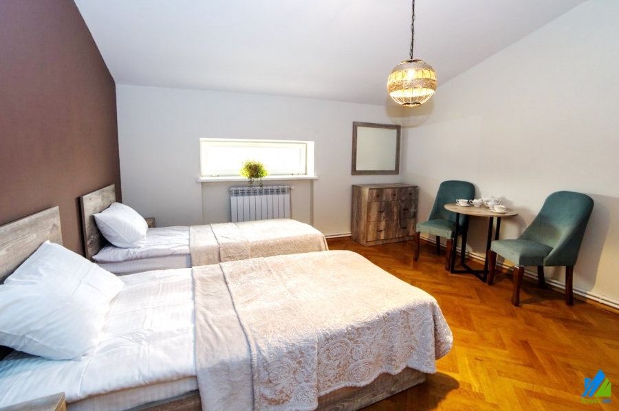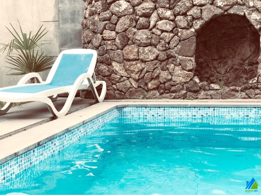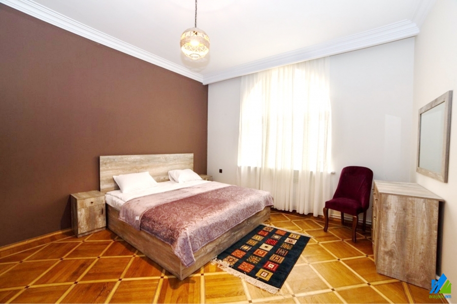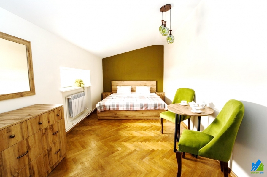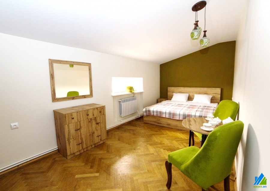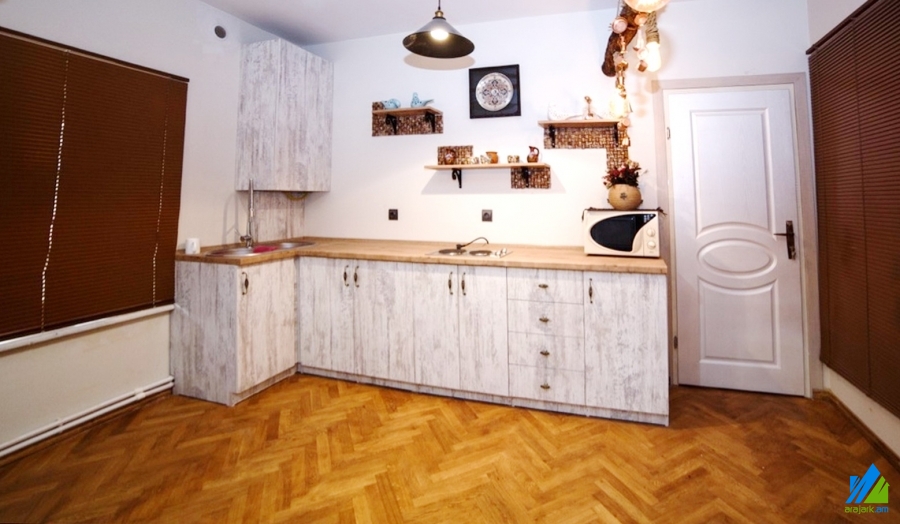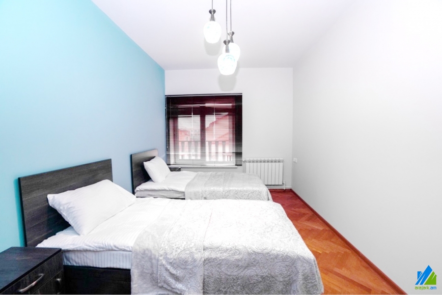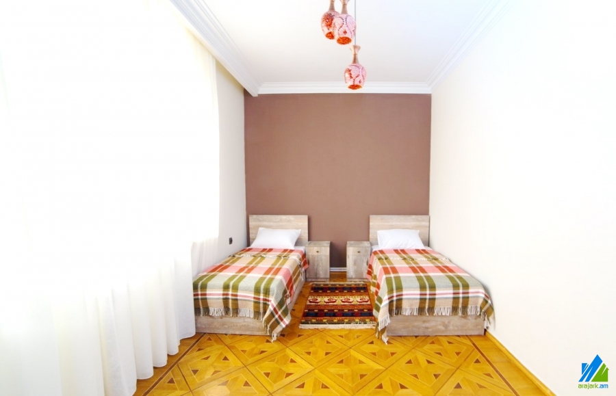 3-storey house for sale and rent on Azatamartikner Avenue. The rooms' quantity is 13 (a hall and 12 bedrooms). The house is modern renovated and is stationed on the first line. The entrance door is iron-made, the windows are euro-based, the floor is covered by parquet, laminate and solid granite. The bathroom(4) is combined and modern tiled. The electric wires and pipes are newly changed. The house has a stone garage, balcony, cellar(170sm), attic(110sm), stone fence, nice yard with decorative trees, garden with fruitful trees, flowerbed, fireplace, swimming pool, sauna, summer kitchen, heating system, kitchen furniture and is supplied with constant water and gas. The area of free land is 450sm. The view is towards the street and yard. The partial rent is also possible. The upper 2 floors for 2000$.
