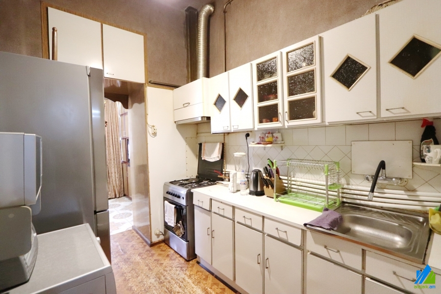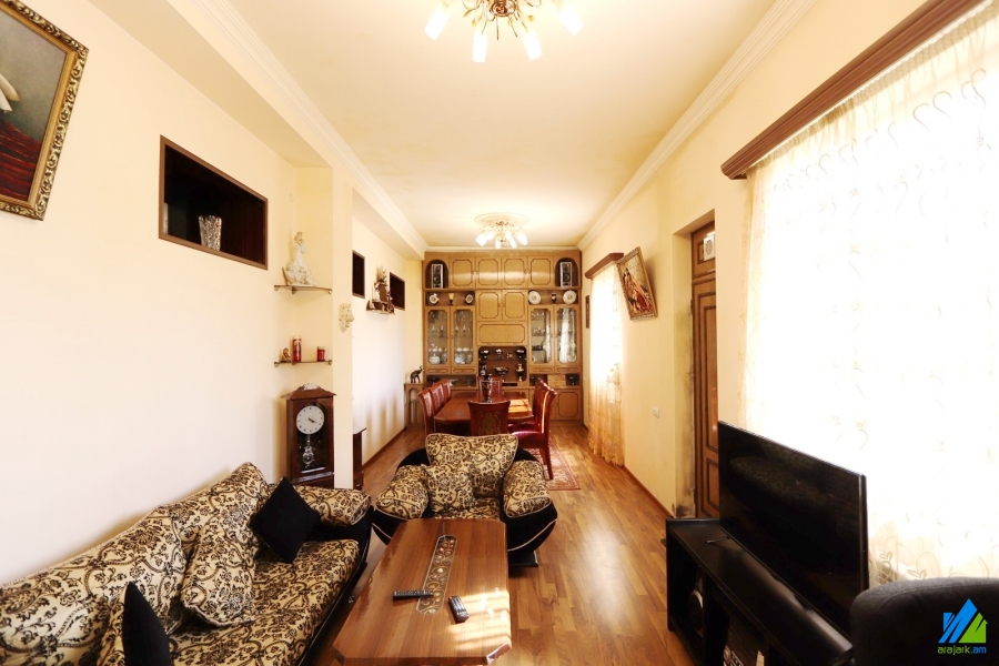 An apartment for sale in Shahsuvaryan Street. The rooms' quantity is 4 ( a hall and 3 bedrooms). The apartment is partially newly renovated and is located on the high-rise ground floor of the 3-storey stone building that is stationed in the 1st line. The entrance door is made of iron, the windows are euro-based, the floor is covered by laminate and is tiled. The bathroom is separate, the electric wires and pipes are newly changed. It has a balcony, cellar, storage, stone garage (+10000$), heating system and is supplied with constant water and gas supply. The entrance is from the yard. The view is towards the yard.