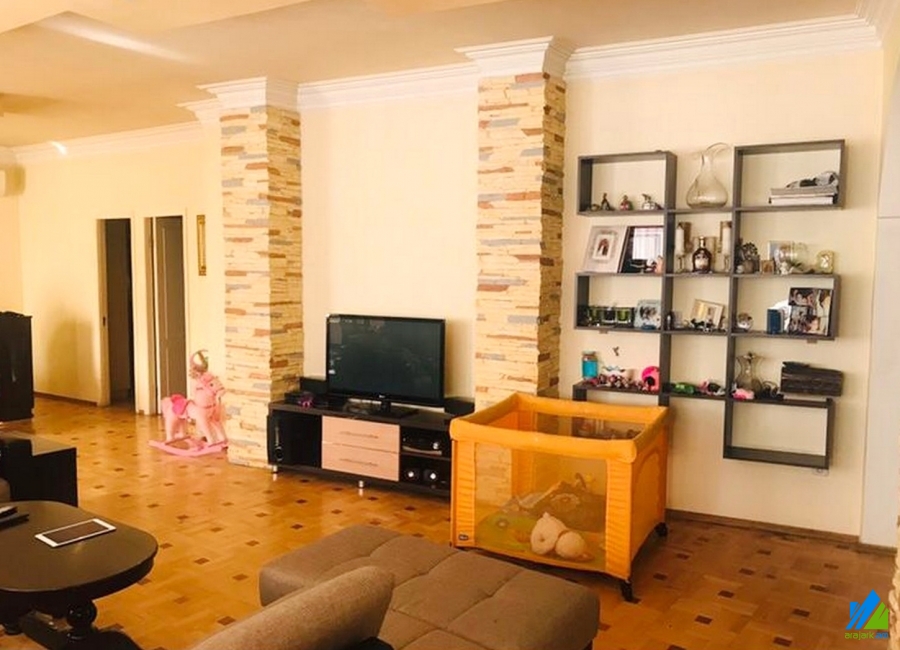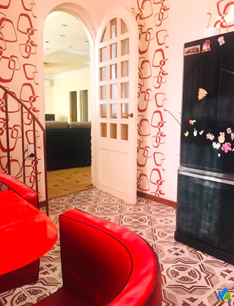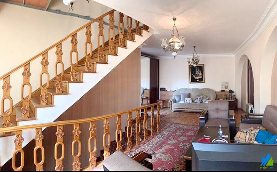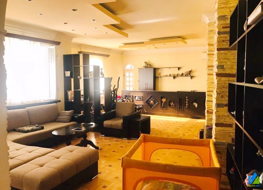 3-storey house for sale in Aygestan 11-th street. The rooms' quantity is 7 (3 halls and 4 bedrooms). The house is former newly renovated. The entrance door is iron-made, the windows are euro-based and wooden, the floor is covered by parquet and is tiled. The bathrooms(3) are combined and former tiled, the electric wires and pipes are newly changed, the roof is repaired. The house a has nice yard with fruitful and decorative trees, balcony, swimming pool, fireplace, stone garage and fence, cellar, attic, heating system and is supplied with constant water and gas.