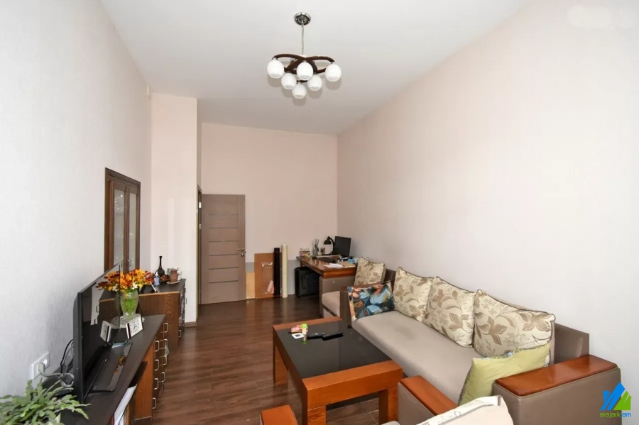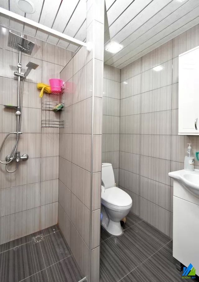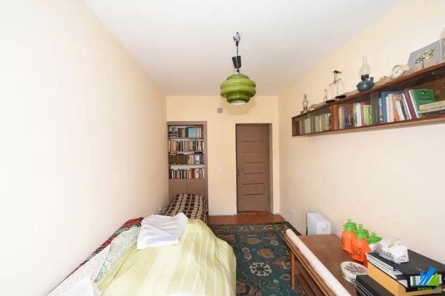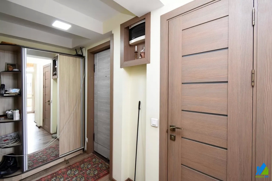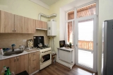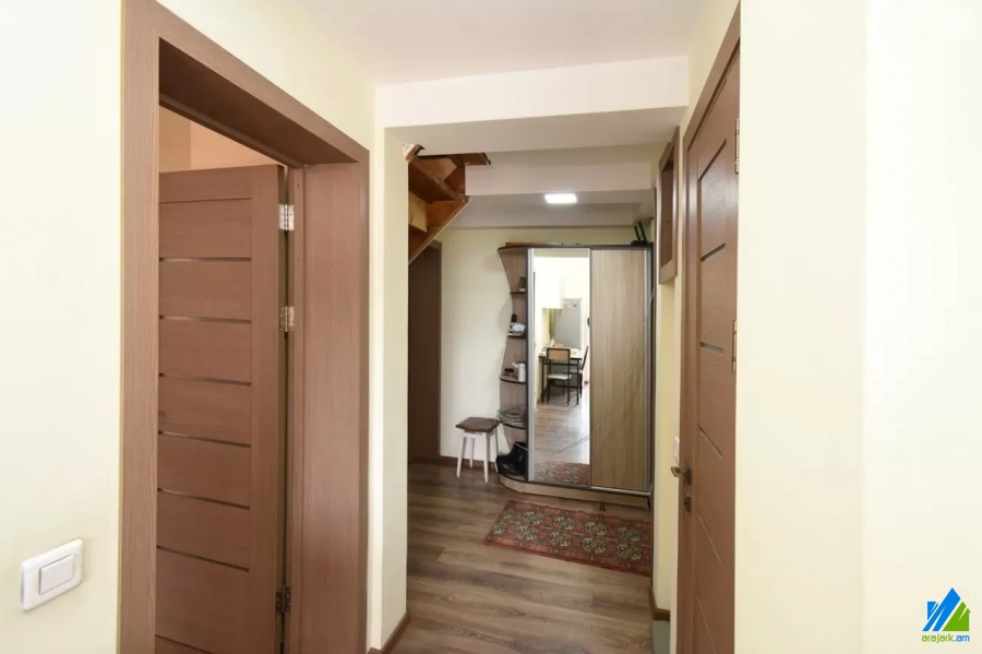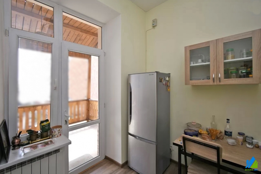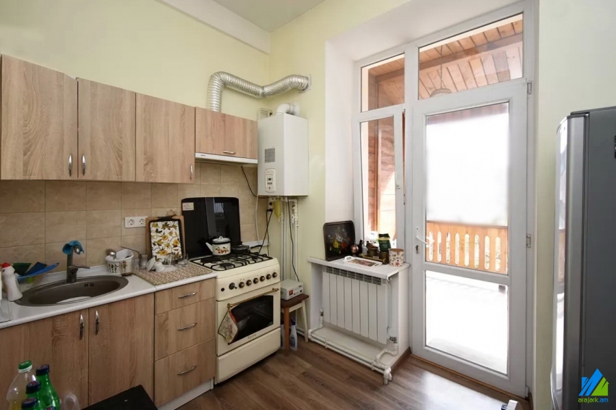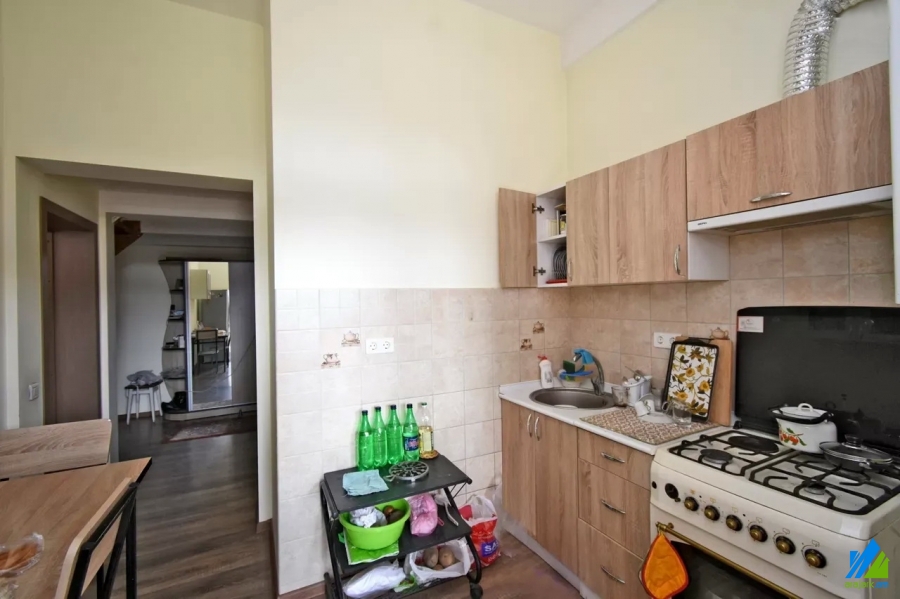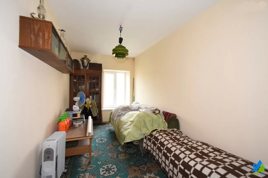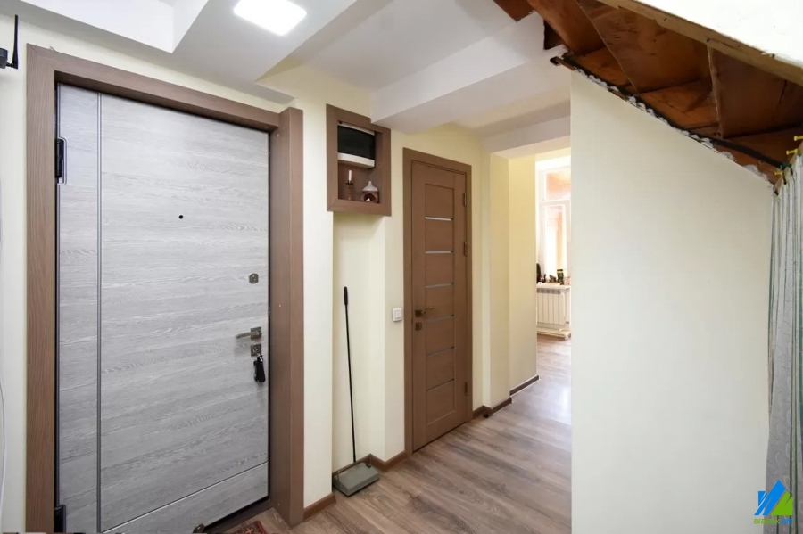An apartment for sale in Pushkin Street. The rooms' quantity is 3 (1 hall and 2 bedrooms). The apartment is newly renovated and is located on the top floor of the 3-storey stone building, that is stationed on the first line. The entrance door is iron-made, the windows are euro-based, the floor is covered by laminate and is tiled. The bathroom is combined and tiled, the electric wires and pipes are newly changed, the roof is repaired. The apartment has 2 balconies, built-in closet, air-conditioner, heating system and is supplied with constant water and gas.