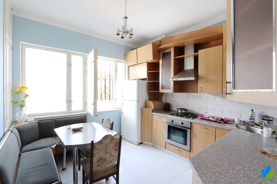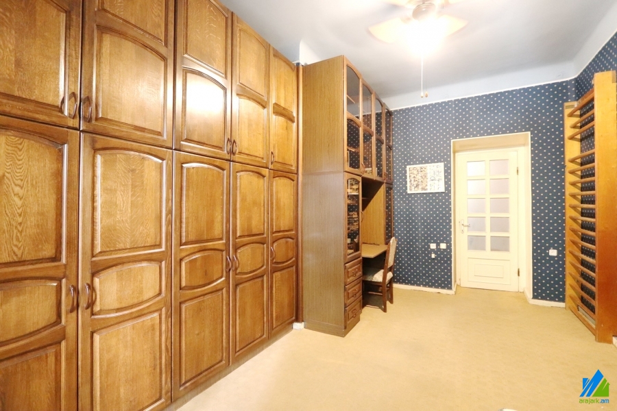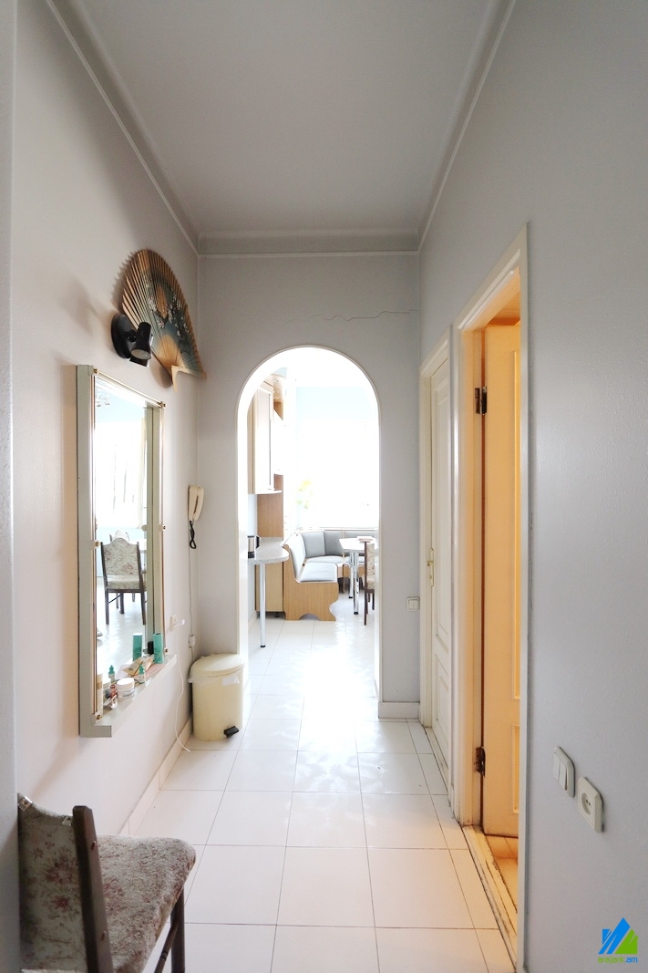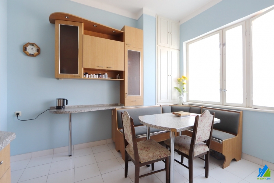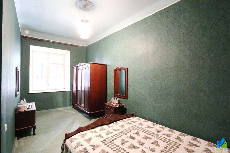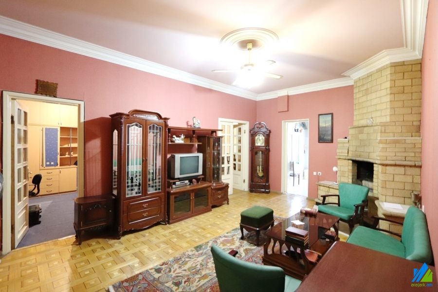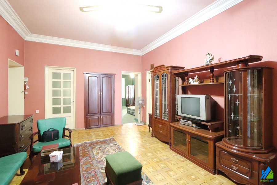 An apartment for sale in Khorenatsi Street. The rooms' quantity is 4 ( a hall and 3 bedrooms). The apartment is former newly renovated and is located on the 2nd floor of the 3-storey stone building that is stationed i the 1st line. The entrance door is iron-made, the windows are wooden, the floor is covered by parquet and is tiled. The bathroom is separate and tiled, the electric wires and pipes are newly changed. It has a cellar, balcony, fireplace and is supplied with constant water and gas. The view is towards the yard and the street. The apartment can be sold with furniture. The apartment is being sold with stone garage.