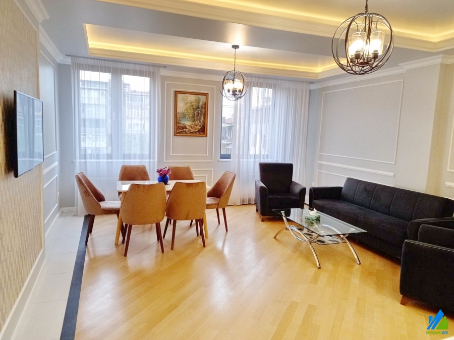 An apartment for rent in Sayat-Nova Avenue. The rooms' quantity is 3 (1 hall, 2 bedrooms). The apartment is modern renovated and is located on the 4th floor of he 22-storey new-built building that is stationed on the 1st line. The entrance door is iron-made, the windows are euro-based, the floor is covered by parquet and solid granite. The bathrooms are combined, separate and modern tiled. It has a heating system and is supplied with constant water and gas.