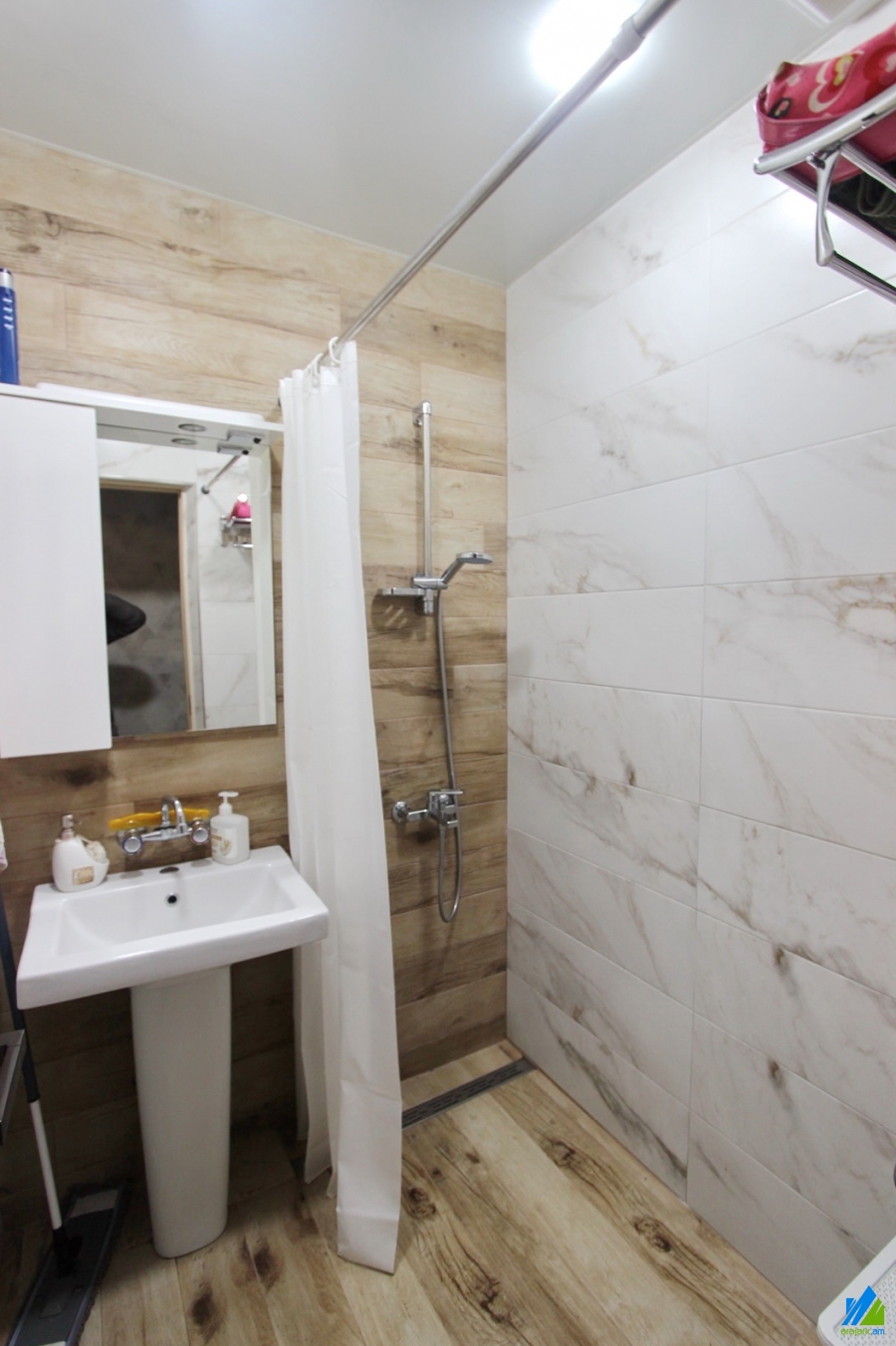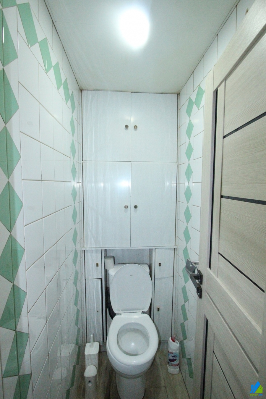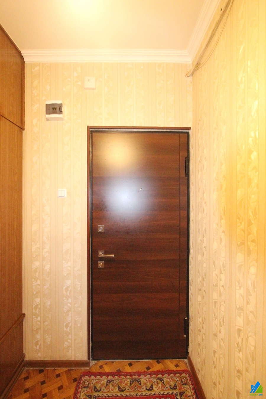 An apartment for sale in Mari street. The rooms' quantity is 3 ( a hall and 2 bedroom). The apartment is cosmetically renovated and is located on the 4th floor of the 5-storey panel building which is stationed on the 1st line. The entrance door is iron-made, the windows are euro-based, the floor is covered by parquet and is tiled. The bathroom is separated and is tiled, the electric wires and pipes are newly changed. It has built-in closets, a balcony, heating system and is supplied with constant water and gas. The apartment is being sold with some furniture.