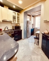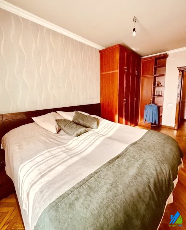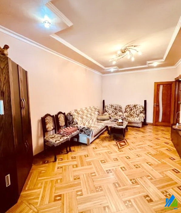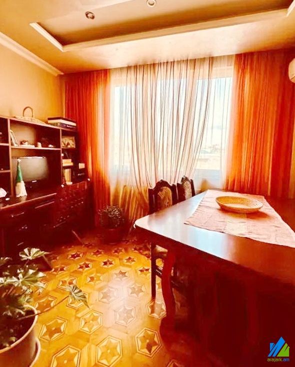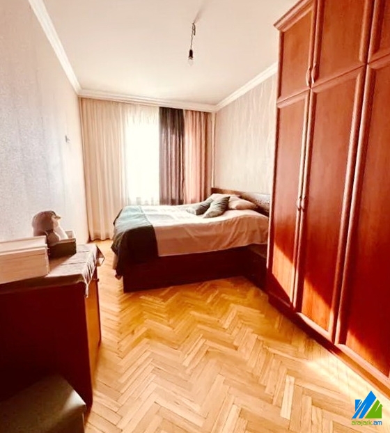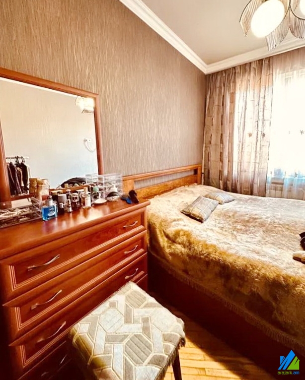 An apartment for sale in Acharyan Street. The rooms' quantity is 3 (a hall and 2 bedrooms). The apartment is capitally renovated and is located on the top floor of the 5-storey stone building. The entrance door is iron-made, the windows are euro-based, the floor is covered by parquet and is tiled. The bathroom is separated and modern tiled, the electric wires and pipes are changed. The apartment has a balcony, heating system and is supplied with constant water and gas. The apartment is being sold with furniture and electronic devices. It has also a garage which costs 16000$.