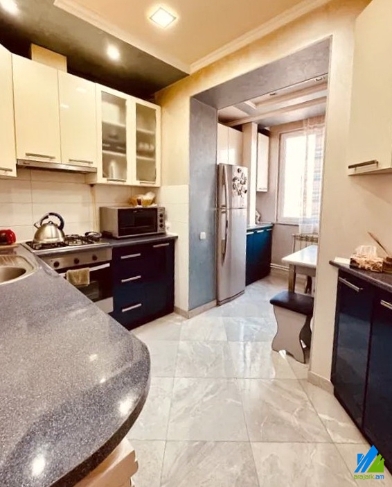 Վաճառվում է 3 սենյականոց բնակարան Աճառյան փողոցում՝ 5 հարկանի քարե շենքի վերջին հարկում: Բնակարանը կապիտալ վերանորոգված է: Մուտքի դուռը՝ երկաթյա, պատուհանները՝ եվրո, հատակը՝ սալիկ, գորգ մանրահատակ։ Սանհանգույցը՝ առանձին, նորաոճ սալիկապատ, էլ․ լարերը և խողովակները՝ փոխված։ Ունի փակ լոջա, ջեռուցման համակարգ, մշտական ջուր և գազ: Վաճառվում է կահույքի և տեխնիկայի հետ միասին: Վաճառվում է նաև ավտոտնակ՝ 16000$ արժողությամբ: