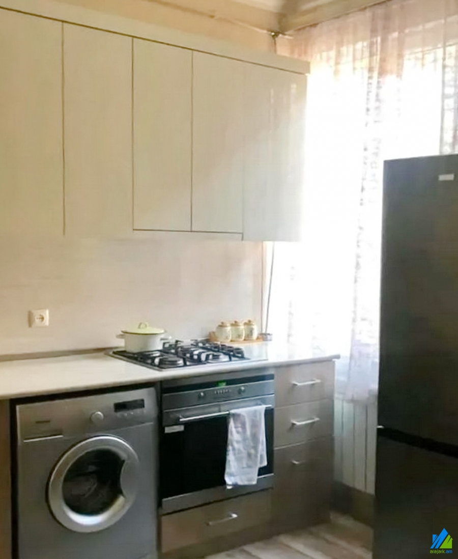An apartment for rent in Moldovakan Street. The rooms' quantity is 2, which includes a hall and a bedroom. The apartment is capitally renovated and is located on the ground floor of the 6-storey building. The entrance door is iron-made, the windows are euro-based, the floor is covered by laminate and is tiled․ The bathroom is separated and tiled. The apartment has а balcony, heating system and is supplied with constant water and gas. The apartment is being rent with furniture and electronic devices.