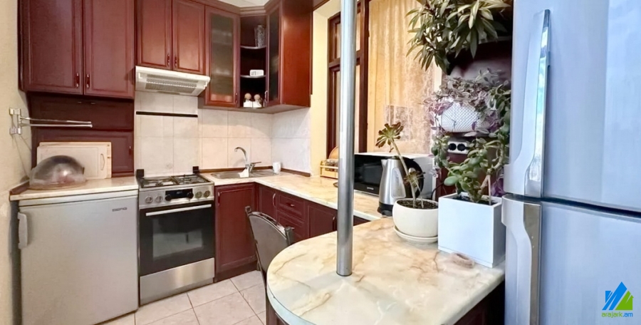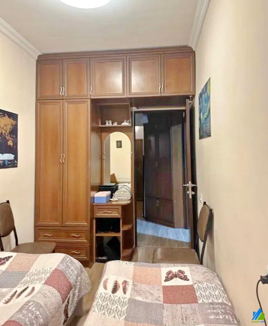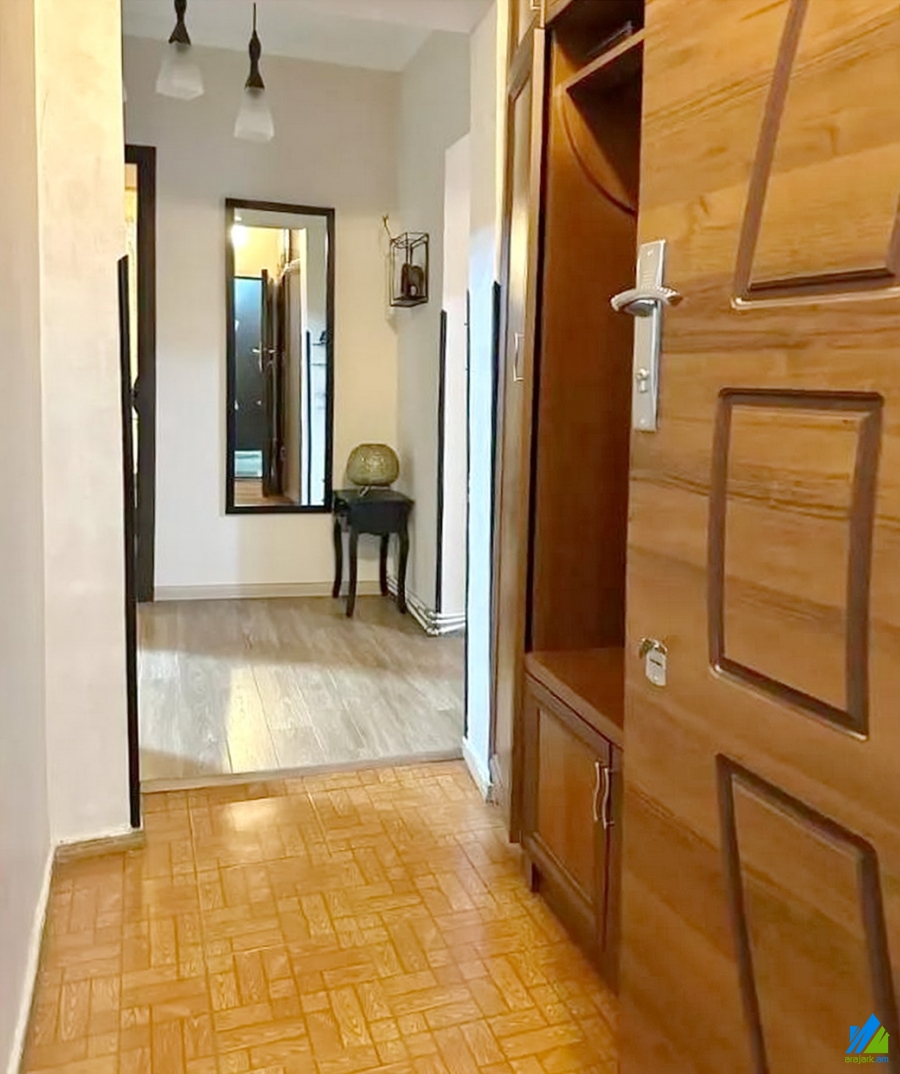 An apartment for sale in Narekatsi District. The rooms' quantity is 1 room apartment remodeled into 2 ( hall and a bedroom). The apartment is newly renovated and is located on the 7th floor of the 9-storey building. The entrance door is iron-made, the windows are euro-based, the floor is covered with laminate and is tilled. The bathroom is combined and tiled. It has a balcony, storage-room, heating system and is supplied with constant water and gas. It is being sold with furniture and electronic devices.